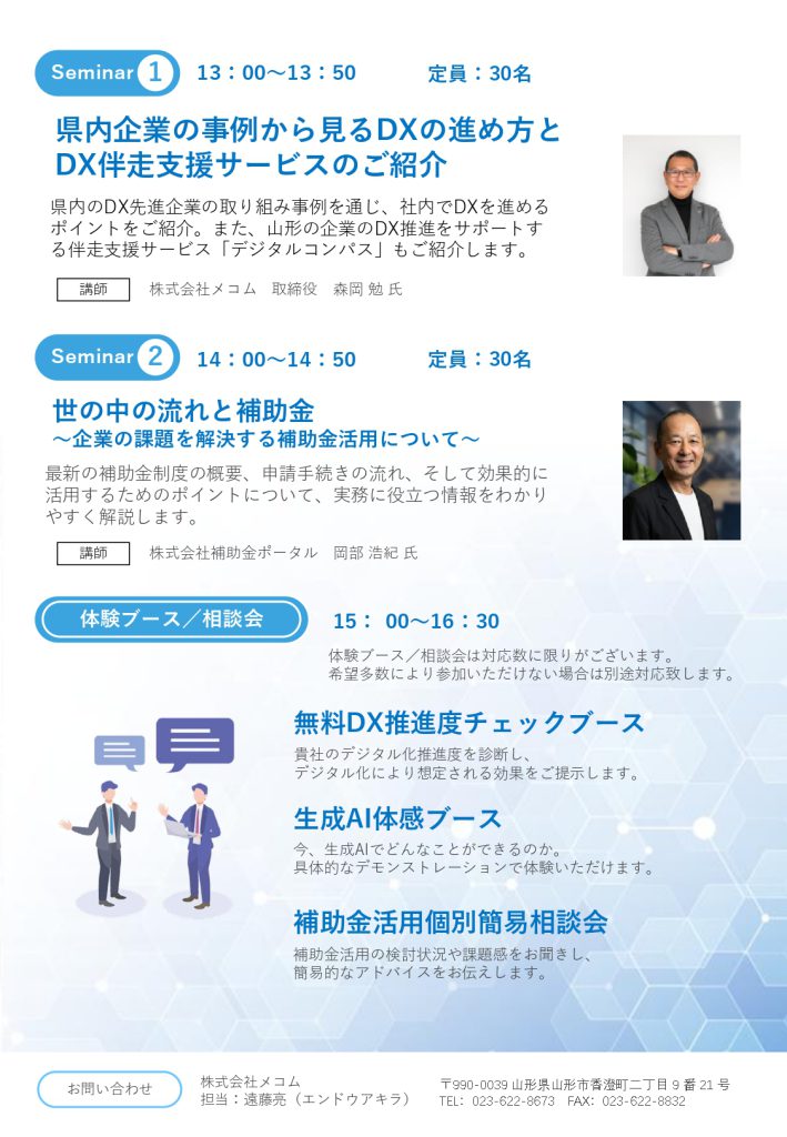 セミナー 2講演|13:00~14:50 体験ブース|15:00~16:30 無料DX推進度チェックブース / 生成AI体感ブース / 補助金活用個別簡易相談会 |